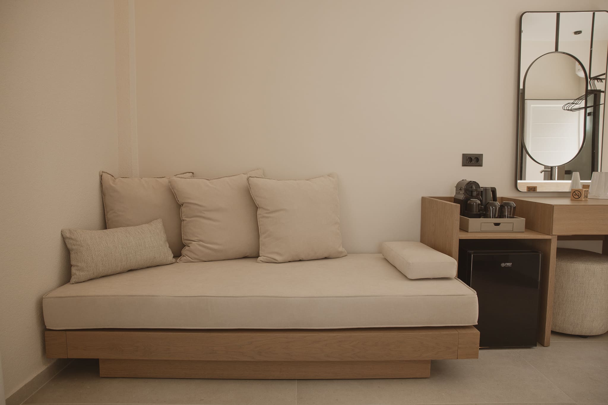 - Mini fridge, coffee maker and kettle